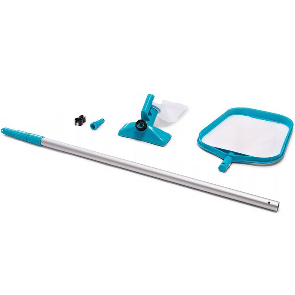 Для очистки дна бассейна от мусора необходимо в вакуумную насадку вставить садовый шланг, при этом второй конец подключить к водопроводу или погружному насосу. На второе отверстие в насадке одевается специальный мешочек для сбора мусора и крепится телескопическая трубка. Погружаем насадку в воду и прижимаем ко дну, включаем подачу воды и плавно, не поднимая насадку, направляем ее по дну и собираем мусор. Струя воды проходя через насадку, меняет направление и попадает в мешочек, затягивая за собой мусор. Далее свободно проходит через пористый материал мешка, оставляя в нем грязь. Важно держать насадку вплотную ко дну бассейна, иначе струя воды будет бить в дно и поднимать мусор, распыляя его по всему бассейну. Фактически, набор для чистки 28002 Intex одновременно чистит дно и наполняет бассейн свежей водой.