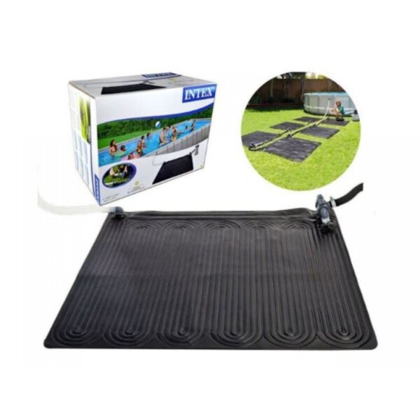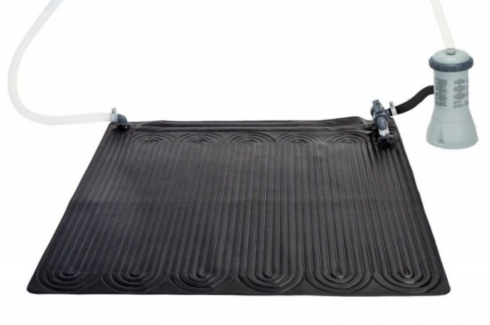 Нагреватель подключается к фильтрующему насосу и вода, проходя через него, нагревается. Такие панели способны повысить температуру воды примерно на 3-5 °C в бассейнах объёмом до 30280 л. Достаточно легко устанавливается - просто расстелите панели рядом с бассейном на открытой площадке и присоедините к фильтрующему насосу. Рекомендуется использовать совместно с солнечными покрывалами, которые способствуют нагреву и уменьшают теплопотери ночью. Эффективность нагревателя
