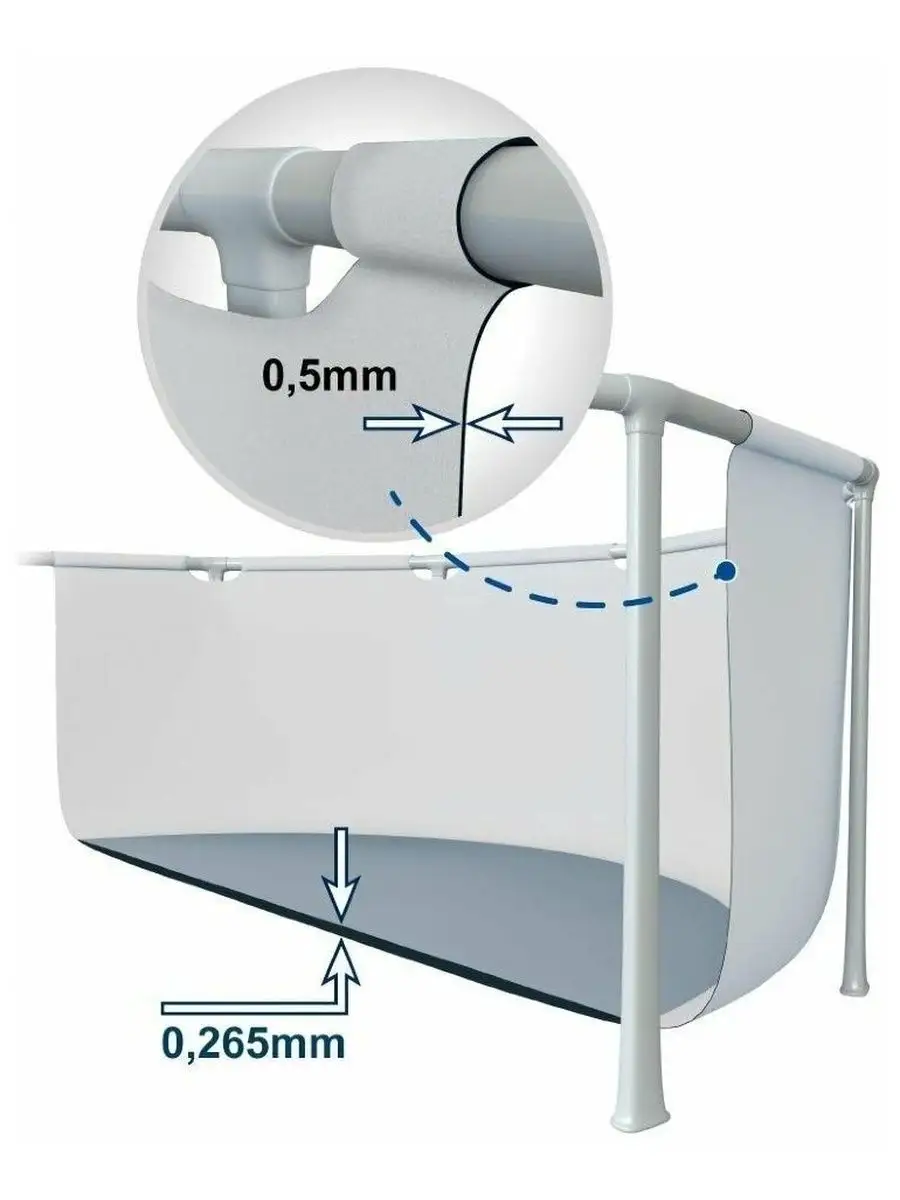 Чаша бассейна изготовлена из плотного армированного материала. Из трех спаянных слоев: двух слоев плотного винила и армирующей сетки из полиэстера между ними. Такое сочетание наделяет материал огромным запасом прочности. Он не подвержен воздействию солнечных лучей, растягиванию и истиранию.Надежный нержавеющий стальной каркас